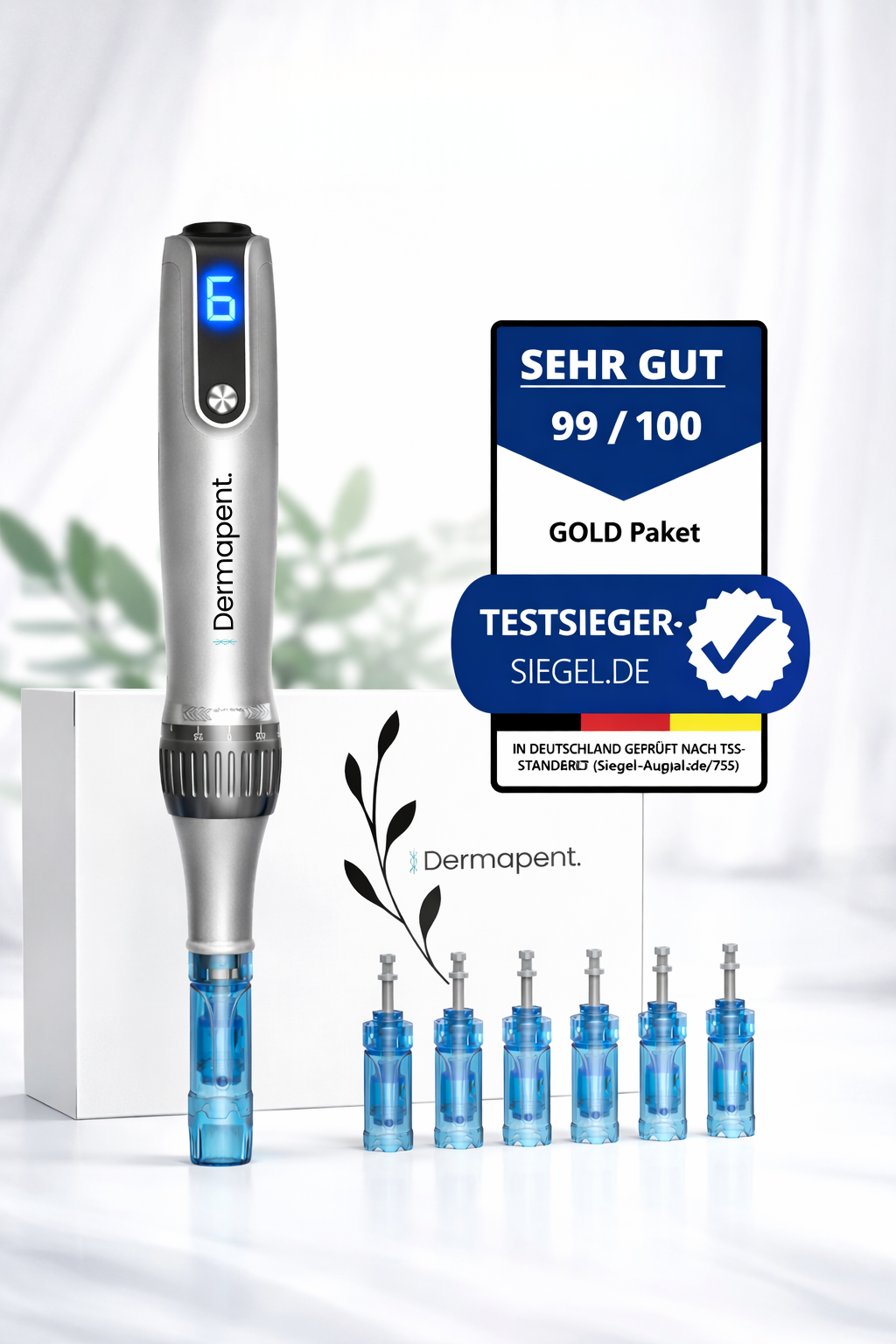 - Dermapent. Pro with precisely adjustable needle length (0.2 – 2.5 mm) and 6 intensity levels